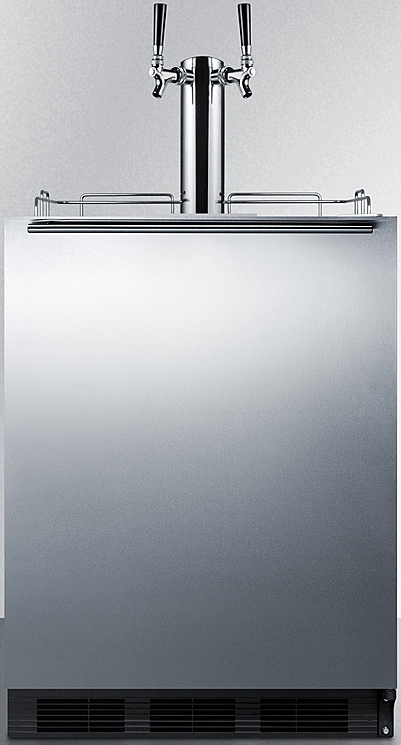 Sized at 32 inches high, the SBC58BLBIADACFTWIN is designed to fit under lower ADA compliant counters. The front-breathing design allows built-in installation, while the fully finished black cabinet also enables freestanding use. This unit features a user-reversible 304 grade stainless steel wrapped door complete with a stainless steel handle mounted horizontally for a modern look. We include a guard rail (ships uninstalled) and removable two-piece stainless steel drip tray for cleaner service. This unit ships with an NSF-listed stainless steel tap kit that includes everything you need to serve iced coffee, including a standard dual tap draft tower, regulator, and nitrogen tank.